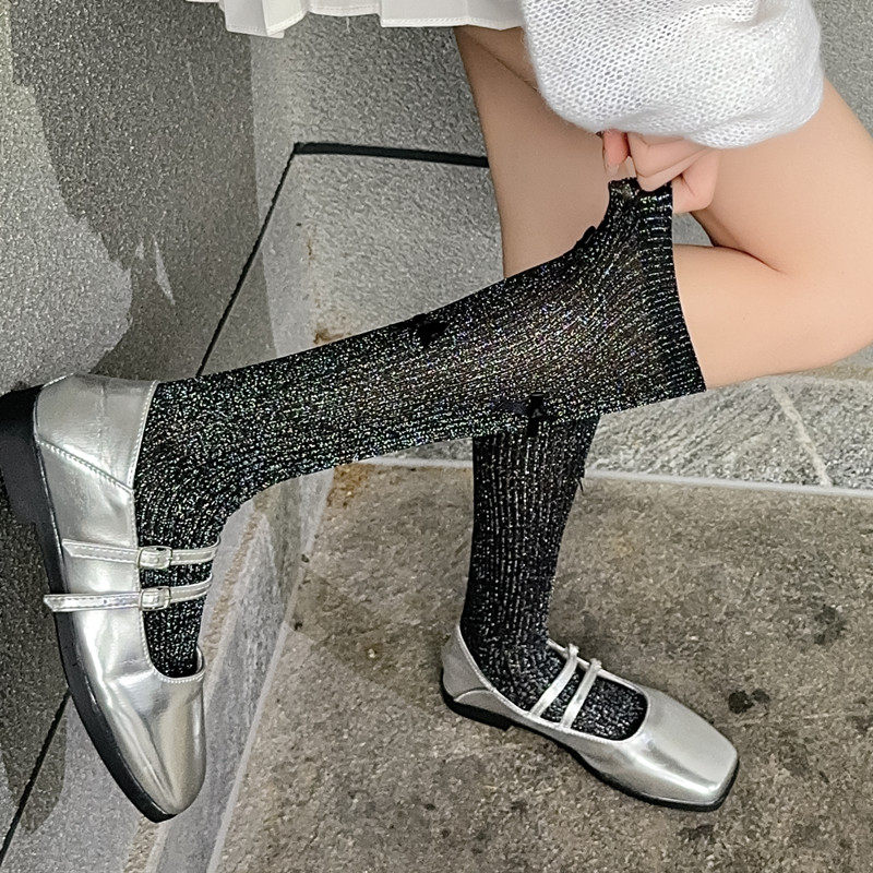 These women’s calf-length socks are designed for everyday fashion wear during the spring and summer seasons. Inspired by ballet-style aesthetics, they feature a delicate bow accent combined with a subtle sheer, silky-textured finish, creating a light and elegant look suitable for warm-weather styling.