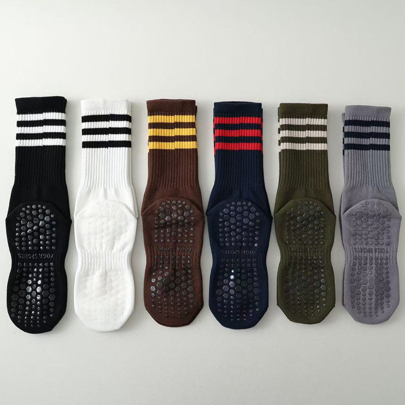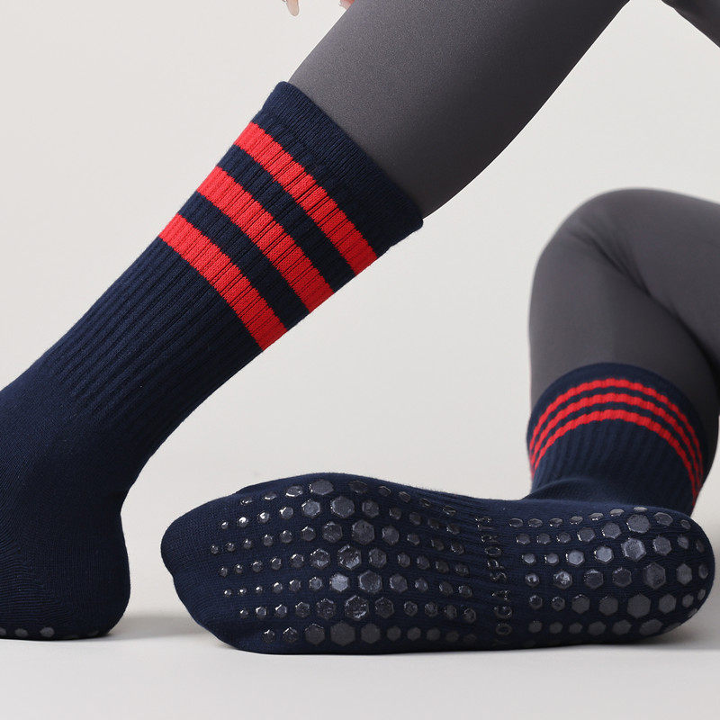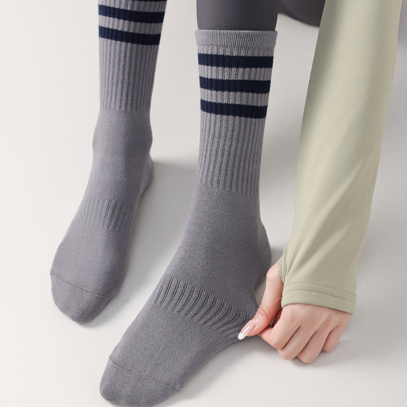 The mid-high length provides light coverage around the calf while allowing natural flexibility during exercise. A striped design adds a clean, sporty look that pairs easily with activewear, making these socks suitable for both workout sessions and casual indoor use. The sole features a textured grip pattern designed to help improve traction on smooth indoor surfaces, including studio floors, mats, and hardwood areas.