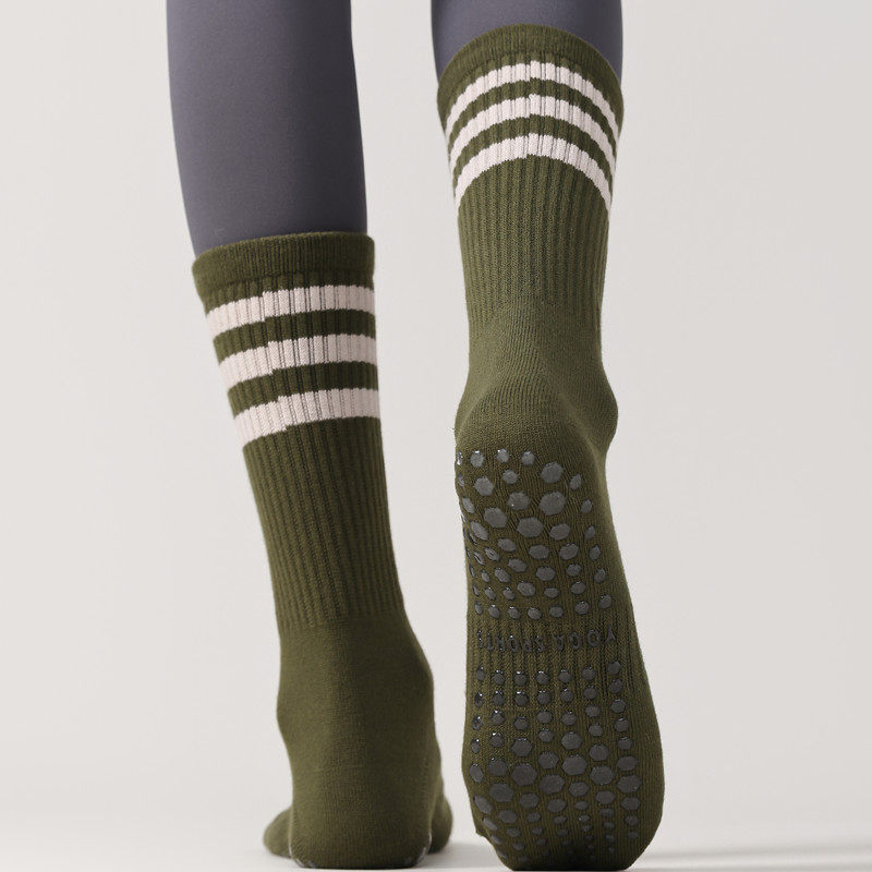 These women’s mid-calf yoga socks are designed for indoor fitness activities such as yoga, pilates, barre, stretching, and floor-based workouts. Crafted from comfortable cotton-blend fabric, they offer breathable wear and soft support suitable for daily movement and studio routines.