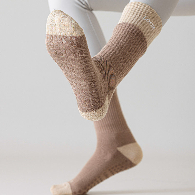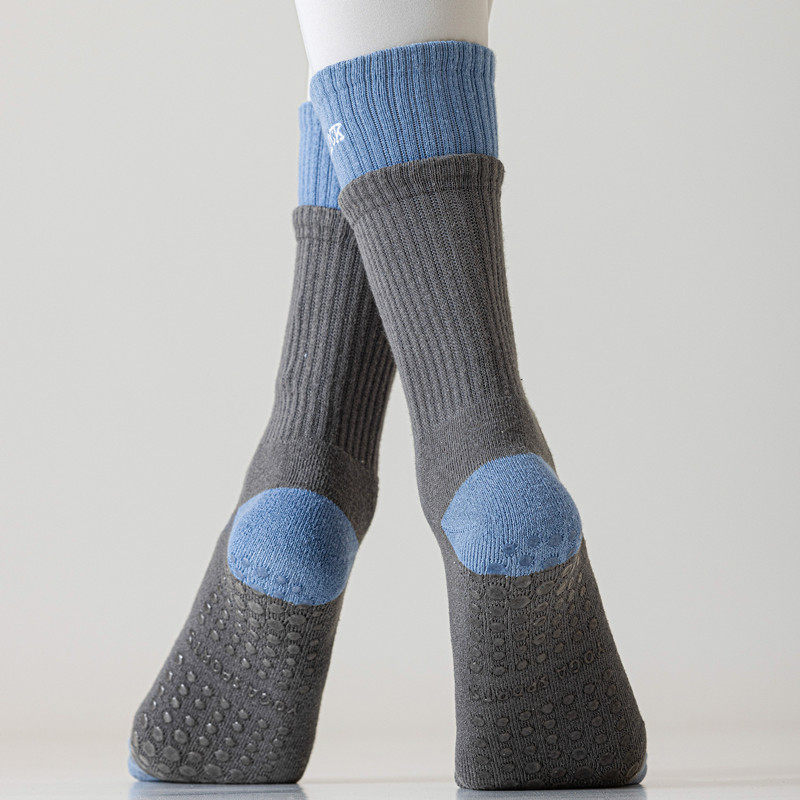 These women’s cushioned yoga socks are designed for indoor fitness activities such as yoga, pilates, stretching, and low-impact floor exercises. Made from soft terry-style cotton fabric, they offer a thicker, comfortable feel that helps provide warmth and gentle cushioning during autumn and winter indoor workouts.