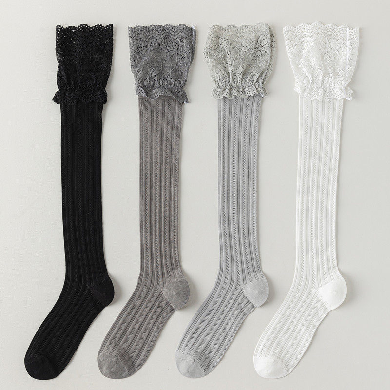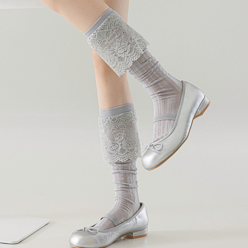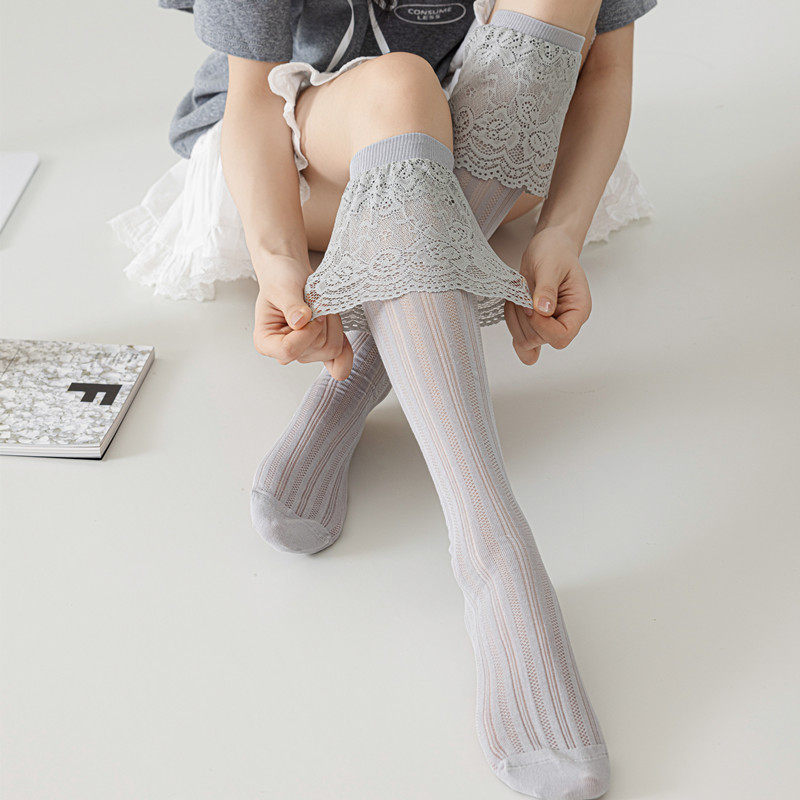 These long calf socks feature a delicate lace-trim detail combined with a lightweight cotton-blend knit, offering a refined appearance suitable for everyday styling. The clean silhouette and soft texture make them easy to pair with boots, loafers, or casual footwear, creating a balanced look for daily outfits and layered wear.