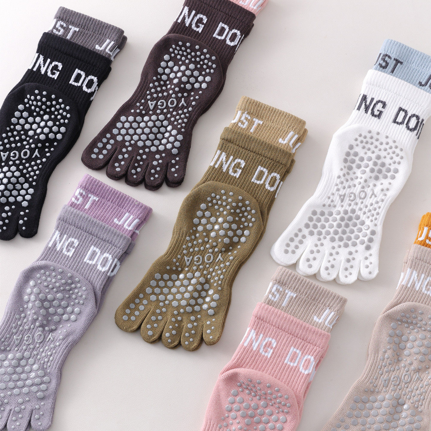 A textured grip pattern on the sole is designed to help enhance traction on smooth indoor surfaces such as yoga mats, studio floors, and hardwood areas. These socks are intended as general indoor sports and fitness accessories and are not medical, corrective, or performance-enhancing products. Easy to care for and suitable for frequent wear, they offer a practical option for women seeking stylish, non-slip five-toe yoga socks for indoor fitness activities.