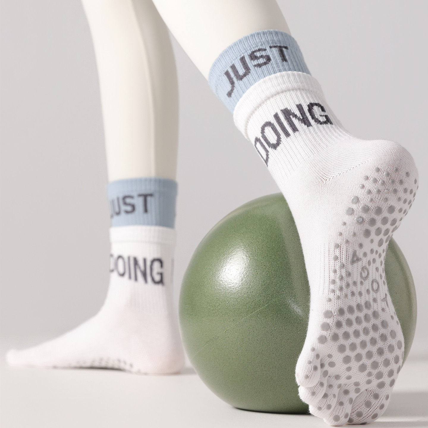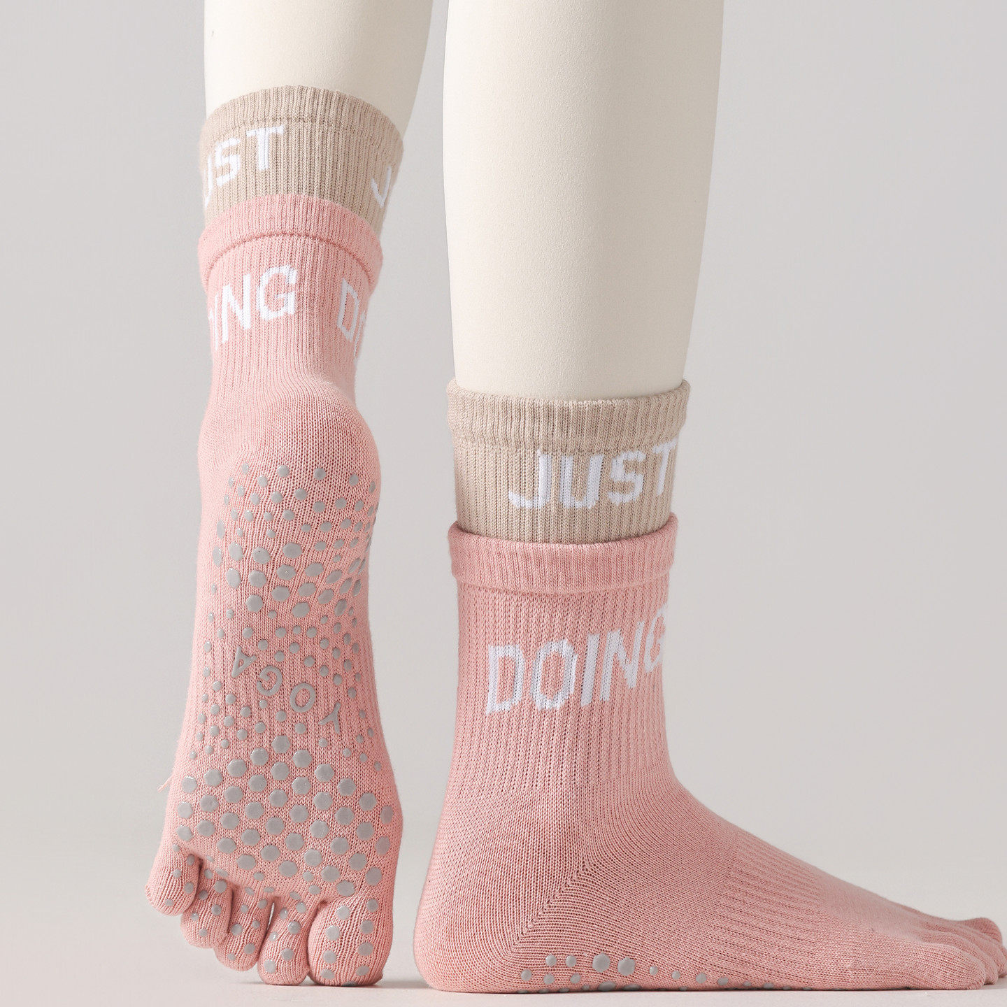 The five-toe, split-toe construction allows each toe to move independently, supporting a natural foot feel during balance-focused and controlled exercises. Made from a soft, breathable cotton-blend fabric, these socks provide comfortable wear for regular indoor use. The mid-calf length offers light coverage without restricting ankle or foot movement, making them suitable for everyday indoor fitness routines.